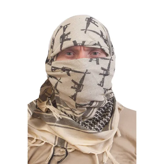 Арафатка цвета светлый беж с чёрным принтом «скрещенные автоматы» и геометрическим узором. Украшена по краям бахромой. Платок из натуральной ткани могут носить и мужчины, и женщины. Подходит для всех сезонов года. Защищает в качестве головного убора от холода, ветра, жары, снега, дождя и других осадков.
