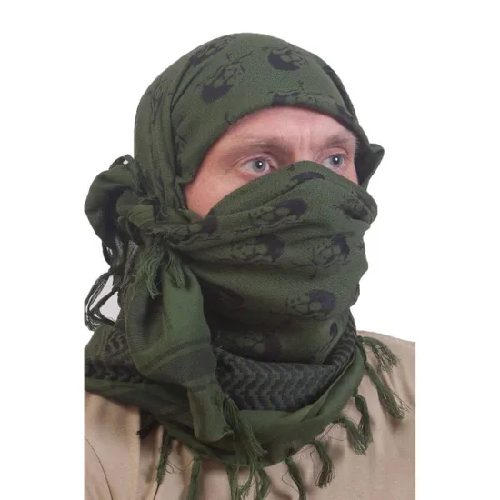 Стильный арабский платок оливкового цвета. Декорирован модным принтом «черепа в касках» и бахромой по краям. Носить могут как мужчины, так и женщины. Подходит на все сезоны года. В качестве головного убора защищает от холода, ветра, дождя, снега, летом – от жары.