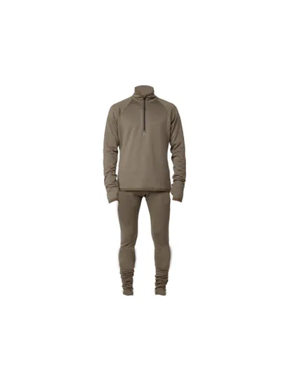 Комплект нательного флисового белья состоит из фуфайки и кальсон. Фуфайка с удлиненной спинкой и длинным рукавом. Воротник-стойка. От середины груди до верха воротника – молния с защитой подбородка. Внизу рукава – отверстие для большого пальца для удобства одевания верхних слоев одежды. Кальсоны прилегающего силуэта. В пояс проложена эластичная тесьма. Белье выполнено из трикотажного полотна флис с выборочным начесом. Рекомендуется одевать непосредственно на тело, а также использовать, как утепляющий слой с демисезонным, ветроводозащитным или утепленным костюмами в зависимости от погодных условий и уровня физической активности.