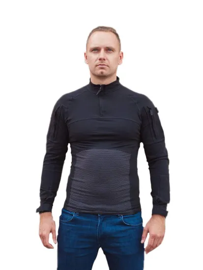 Рубашка предназначена для использования в жаркую погоду в комплексе с бронежилетом. Туловище выполнено из тонкого потоотводящего трикотажа и не имеет лишних мешающихся деталей (карманы и т.п.), а рукава – из стандартной прочной смесовой ткани. Внимание! Данная рубашка не обладает огнестойкими свойствами (FR)