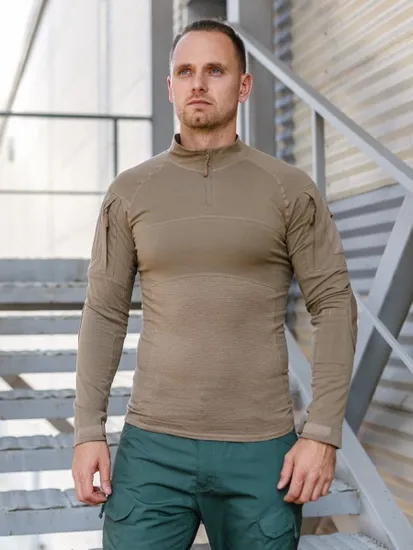 Рубашка предназначена для использования в жаркую погоду в комплексе с бронежилетом. Туловище выполнено из тонкого потоотводящего трикотажа и не имеет лишних мешающихся деталей (карманы и т.п.), а рукава – из стандартной прочной смесовой ткани. Внимание! Данная рубашка не обладает огнестойкими свойствами (FR)