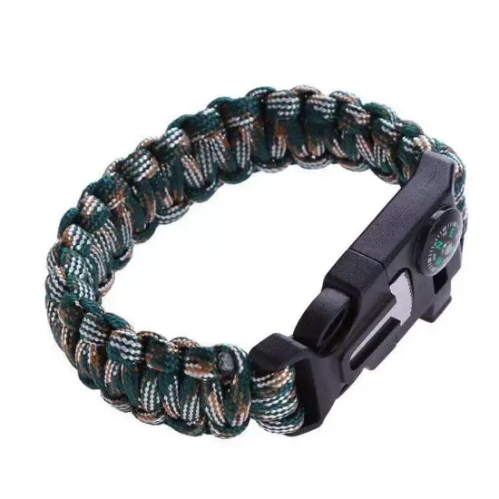 В пряжку вмонтировано огниво, кресало и свисток. На браслет установлен компас.