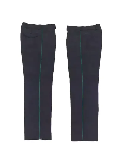 Брюки полушерстяные тёмно-синего цвета с зеленым кантом по боковым швам.