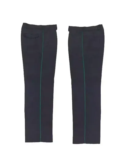 Брюки полушерстяные тёмно-синего цвета с зеленым кантом по боковым швам.