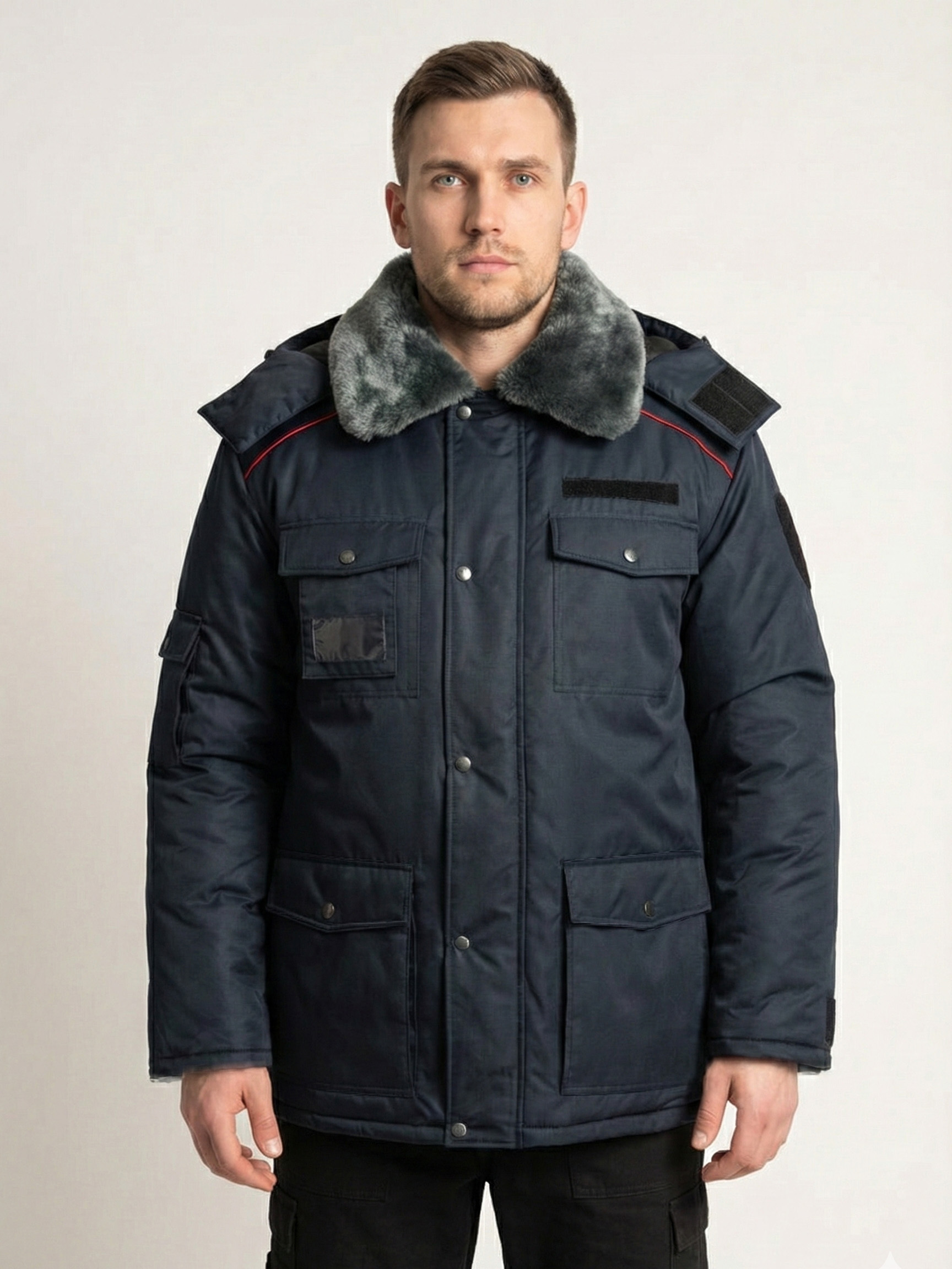 Куртка прямого кроя, с комфортной посадкой для формы и тёплого слоя под низ. Удлинённая, не мешает движению, подходит для длительной носки на смене и при посадке в транспорт.