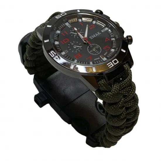 Тактические наручные часы для выживания в экстремальных условиях оснащены всеми необходимыми аксессуарами для туристов. Паракордовый браслет и надёжный пластиковый замок позволят крепко зафиксировать изделие на запястье. Паракорд используется при создании парашютных строп, так что можно не сомневаться в его прочности. Стильный цвет хаки будет прекрасно смотреться не только в дикой природе, но и в повседневной жизни. Сегодня милитари-стиль невероятно популярен среди молодёжи, так что часы помогут привлечь к себе внимание в любой компании. Противоударный корпус из металлического сплава защитит чувствительные внутренние механизмы от негативного воздействия. На стрелки специально нанесён фосфор, так что время можно будет увидеть даже в полной темноте.