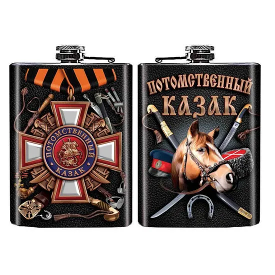 Карманная фляжка из нержавеющей пищевой стали, крышечка с фиксатором. На фляжке тематический рисунок с орденом "Потомственный казак" и основными казачьими атрибутами.