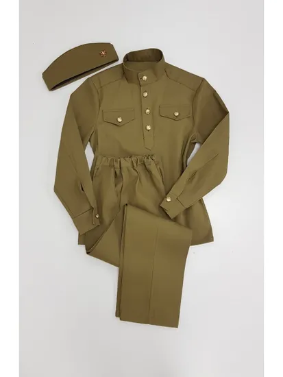 Гимнастерка: Классический мужской фасон в оливковом цвете с золотистыми пуговицами, украшенными звездой и гербом Советского Союза. Удобный крой и свободный силуэт обеспечивают комфорт даже при длительном ношении.