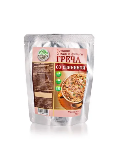 Состав: свинина, крупа гречневая, вода питьевая, масло растительное, лук репчатый свежий, морковь свежая, соль поваренная пищевая, чеснок сушеный, лист лавровый