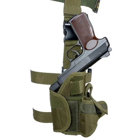 - Тактическая набедренная кобура. Подойдёт для практически любых пистолетов любой модели. Удобно крепится на ноге, при помощи трёх точек крепления. На ремень, и 2 стропы на бёдра. При помощи велкро можно отрегулировать объём кобуры и подогнать его под любой пистолет. Очень крепко фиксирует пистолет в кобуре.