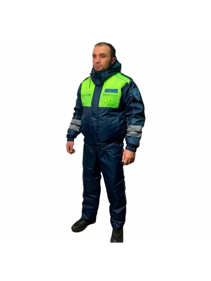 Костюм зимний ДПС нового образца (приказ № 777) с сигнальной вставкой имеет зимнюю куртку и полукомбинезон. Полукомбинезон  предназначен для ношения в холодное время года, имеет два боковых кармана на молнии, а также собственную молнию, что позволяет сохранять тепло внутри.