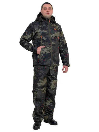 Костюм состоит из куртки и брюк, идеально подойдет для повседневной носки, активного отдыха и охоты . Внешняя поверхность защищает от ветра, а внутренний слой ткани отводит избыточную влагу. Камуфляжный рисунок и цвет дополнительно придаёт костюму визуальную защитную функцию. У куртки капюшон отстегивается. На куртке длинные диагональные карманы на молнии, один карман на рукаве. Низ рукавов оформлен эластичными манжетами и элементами, регулирующими ширину. У брюк пояс эластичный со шлёвками для ношения ремня. Брюки снабжены двумя карманами для рук и двумя карманами на молнии на бедре с декоративно оформленными строчками, что придаёт костюму неповторимость и эксклюзивный вид. По низу куртки и брюк эластичный шнур с регулировкой и фиксацией ширины, что дает дополнительный комфорт при ношении костюма. Костюм гарантированно обеспечит максимум комфорта при занятии любимым увлечением.