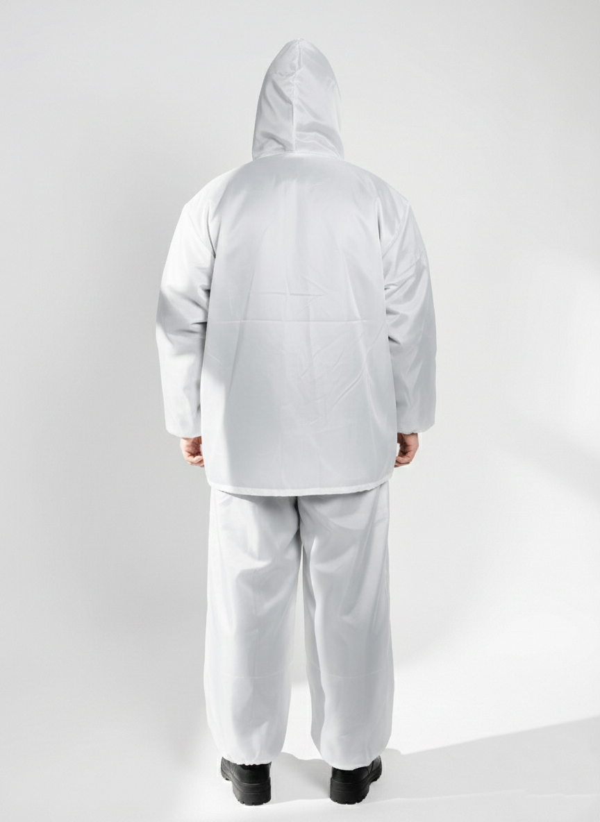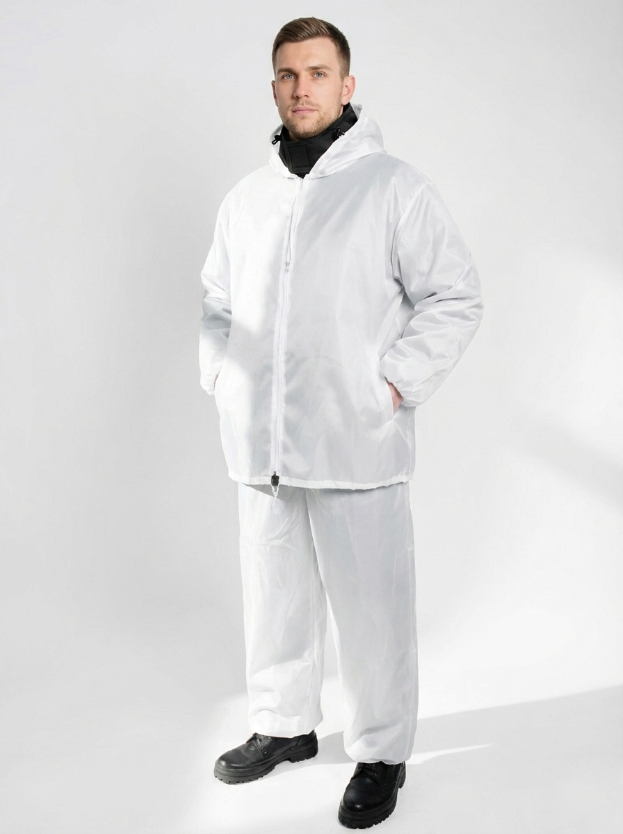 Маскировочный костюм "Зима" в белом цвете - простой и рабочий способ слиться со снежным фоном, когда важны незаметность, быстрый доступ к снаряжению и возможность надеть всё поверх зимней формы.