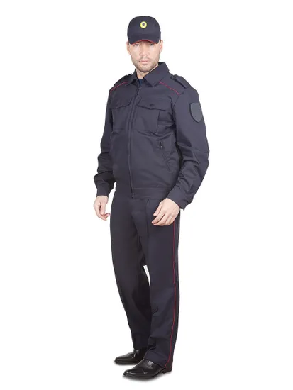 Костюм состоит из куртки и брюк. По кокеткам полочек и спинки вшит красный кант. На рукавах, спине и полочке настрочены текстильные застежки для крепления шевронов. Костюм выполнен из плотной ткани, что придает изделию презентабельный внешний вид.