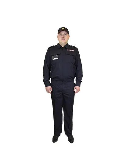 Брюки с притачным поясом, бокорыми карманами в отрезных частях передних половинок, левым задним прорезным карманом с одной обтачкой и клапаном. Пояс брюк застегивается на петлю и пуговицу, гульфик - на застежку-молнию. Ткань полиэфирно-вискозная гладкокрашеная арт. ПВ65-008МВД темно-синего цвета, цвет ткани № 19-4013 ТСХ. ТУ 8572-195-08836809-2012 изв.1