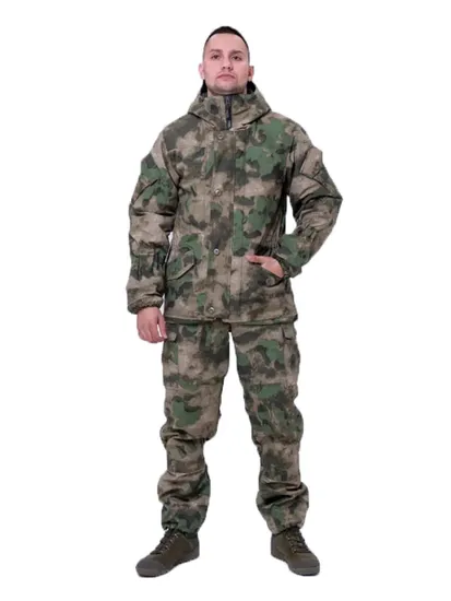 Брюки: Застёжка: гульфик-молния. Пояс со шлёвками. Два боковых кармана. Два прорезных задних кармана с клапаном. Два боковых объёмных кармана с клапаном в области бедра. Усиление на коленках и ягодицах. Низ брюк регулируется тесьмой.
