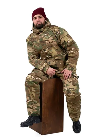 Основная ткань костюма Rip-Stop. Ткань высокопрочная с водоотталкивающей пропиткой. Костюм зима, мужской утепленный, состоит из куртки и полукомбинезона.