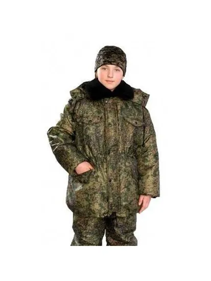 Куртка зимняя удлиненная с отстегивающимся капюшоном и съемным воротником из искусственного меха, с центральной застежкой на тесьму-молнию, прикрытую ветрозащитным клапаном, двумя верхними накладными карманами с клапаном и нижними прорезными карманами прикрытыми клапаном. По линии талии утеплённая куртка стянута тесьмой-кулиской, рукав длинный втачной с внутренним трикотажным манжетом.