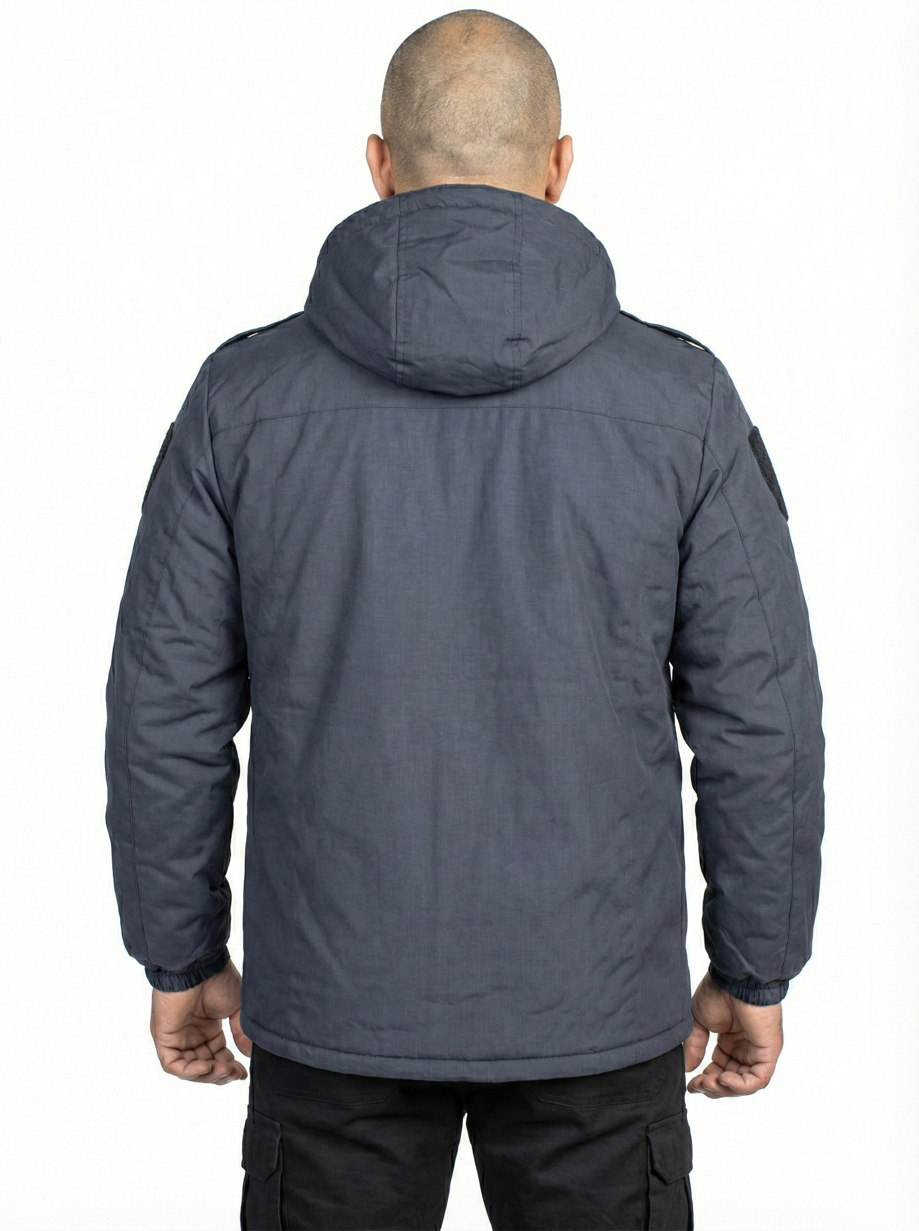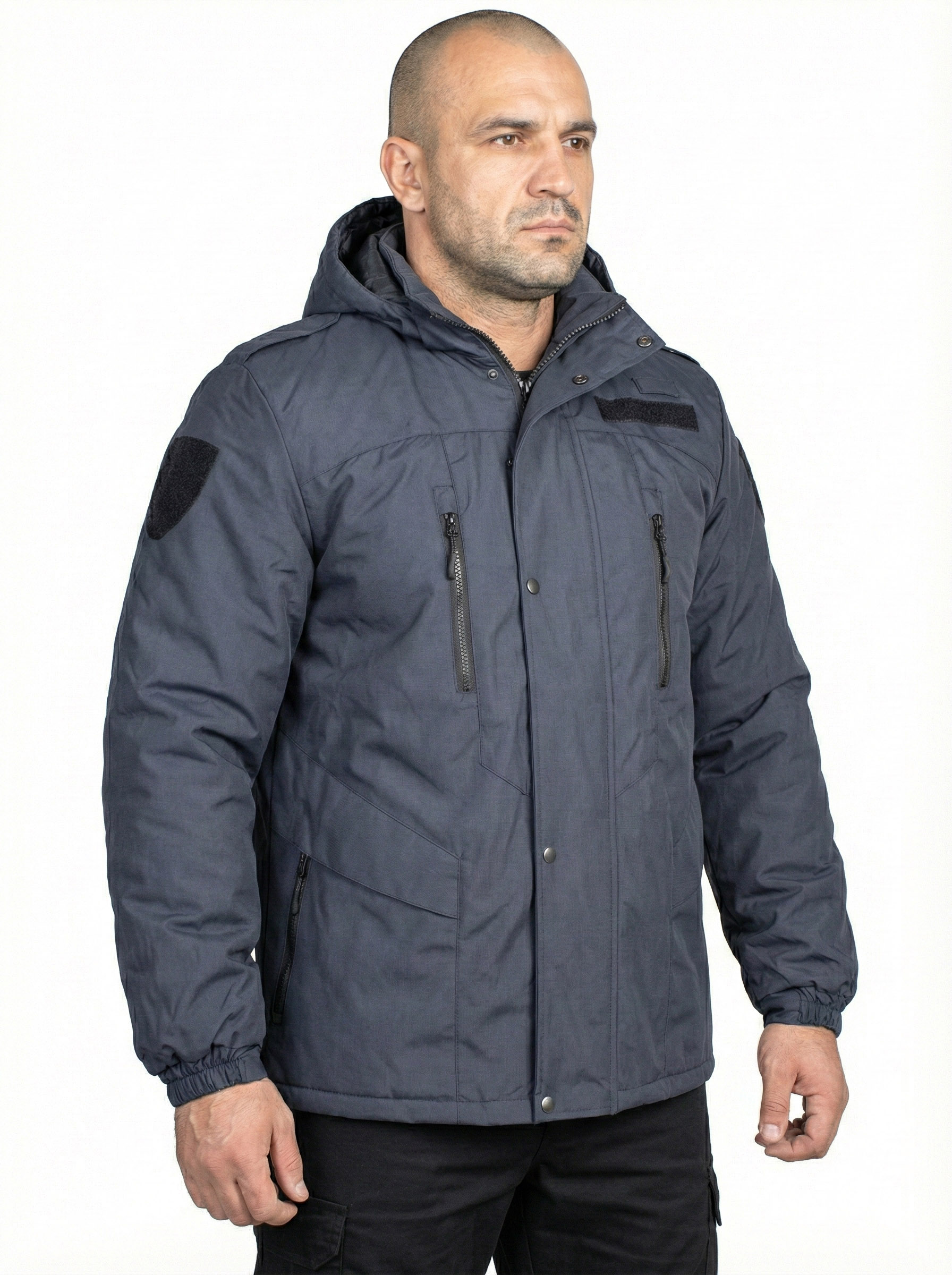Куртка удлинённая, посадка рассчитана на ношение поверх формы и лёгкого утепляющего слоя. В движении не мешает, удобно при посадке в транспорт и при длительной носке на смене. Капюшон и центральная планка помогают сохранить комфорт при ветре.