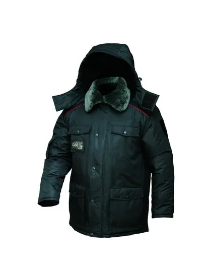 Карманы: 2 нагрудных (в правом - съемный бейдж с прозрачной пленкой), 2 боковых - со входом сверху и сбоку, внутренний слева - с карабином для крепления пистолета, на правом предплечье в карман вшита повязка с световозвращающей лентой, и дополнительные карманы на подкладе и на подстежке. В швах на спинке и полочках - красный кант. Фальшпогоны пристегиваются на кнопку.