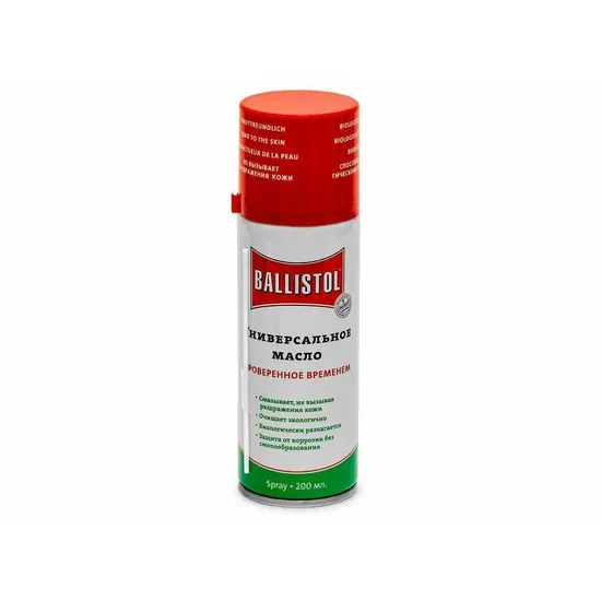 Масло оружейное универсальное Ballistol spray – уникальное многоцелевое немецкое химическое средство. Предназначено для очистки и защиты металлов, кожи, натурального дерева. Продается в аэрозольном баллоне (распыляется под давлением), объем 200 мл.