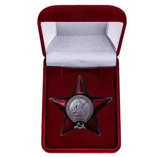 Муляж боевого ордена Красной Звезды из латуни. Покрытие - цветная эмаль и гальваника, крепление на винтовой закрутке. В комплекте с наградой - красивый бархатистый футляр бордового цвета.