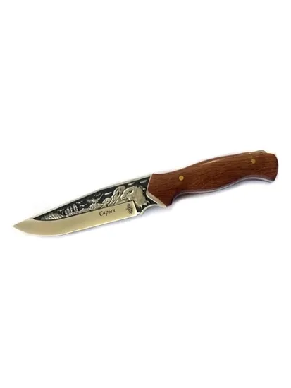 Универсальный полевой нож. Длинный широкий клинок с понижением линии обуха выполнен из прочной стали. Она эффективно сопротивляется коррозии, хорошо держит заточку и одновременно легко точится. В основании клинка имеется специальная выемка для указательного пальца, на случай особо точных манипуляций, когда нож требует идеальной управляемости. Деревянная рукоять анатомически выгодной формы хорошо лежит в руке и защищена от ваги специальной пропиткой. Нож комплектуется удобными ножнами.