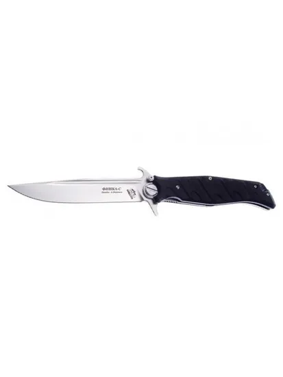 Уникальная особенность конструкции новой «Финки» - инновационно вписанный в мощный осевой узел модифицированный предохранитель «скрытого» типа, «Lawks», гарантирующий от самопроизвольного закрытия клинка, выполненного из легированной инструментальной стали D2, которая отличается твердостью (60 – 61 HRC), устойчивостью к механическим повреждениям и отлично держит заточку. Обработка клинка – сатинирование, упорный шпенек на фиксаторе резьбы. Накладки из высокопрочного пластика G10 черного цвета с трехмерным рельефом поверхности обеспечивают надежный и комфортный хват.