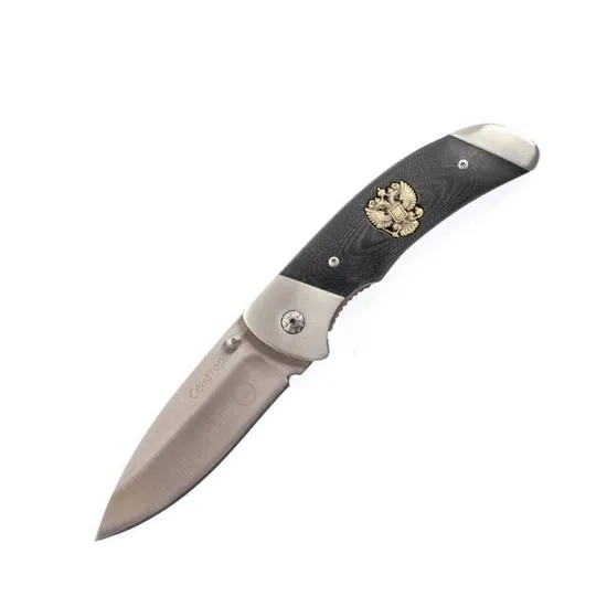 Нож Сенатор- это простой и надежный вариант на каждый день. Нож сочетает в себе классическую геометрию клинка, удобную рукоятку и бюджетные материалы. Набор этих элементов позволил выпустить универсальный нож с невысокой стоимостью. Нож имеет высокие линзовидные спуски, что обеспечивает возможность создания бритвенно острой режущей кромки. К тому же здесь используется нержавеющая сталь средней твердости, которая легко затачивается с помощью любых подручных средств: карманная точилка, донце блюдца, кожаный ремень. На рукояти ножа расположен двух главый орел, который представляет собой герб России. Благодаря этой небольшой детали нож можно использовать в качестве подарка.