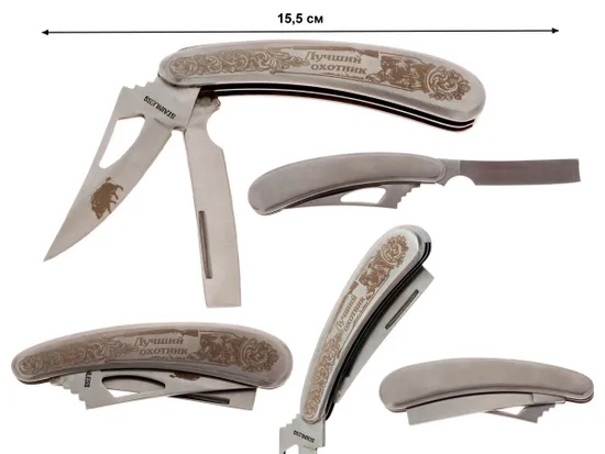 Маленький складной карманный нож с лезвием. На рукоять нанесена гравировка с рисунком медведя и надписью "Лучший Охотник" с узорами. Можно купить в качестве подарка или сувенира любителю охоты, а так же в качестве запасного ножа.