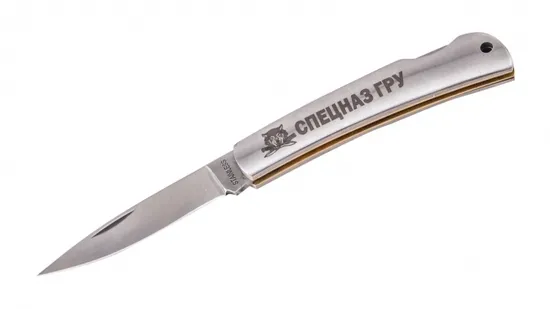 Малый компактный складной нож с нанесенной на рукоять надписью "Спецназ ГРУ" и изображением символики подразделений специального назначения главного разведывательного управления. Подходит в качестве повседневного, туристического или запасного ножа.