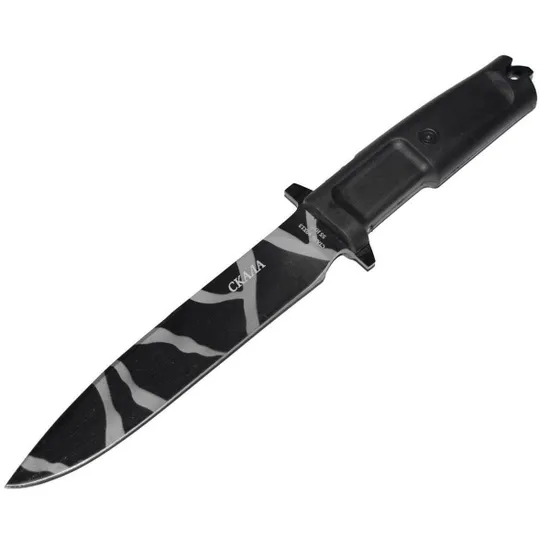 Нож Скала T904 является прототипом армейского ножа "Doberman III" с небольшими изменениями, позволившими не относить данный нож к холодному оружию. Клинок обладает камуфляжной расцветкой и опущенной линией обуха. Рукоять сборная, соединенная стяжным винтом, выполнена из прочной износоустойчивой резины высокого качества. Имеются выемки под пальцы для комфортно и надежного хвата Гарда не позволит соскользнуть кисти с рукояти на лезвие. Пластиковые ножны имеют несколько вариантов крепления на ноги и ремень, снабжены отверстием для стока воды. Для удобства использования имеется отверстие под темляк.