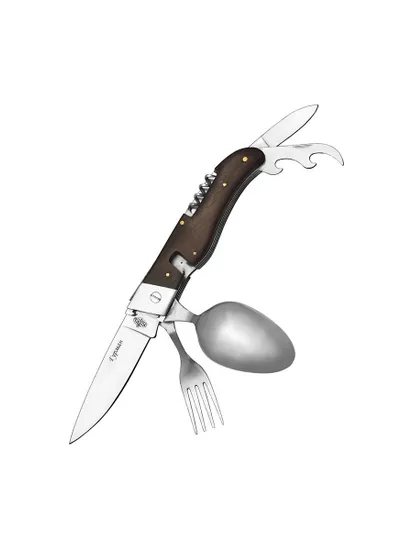Нож Витязь B238-34. Гурман - походный многопредметный нож. В деревянной рукояти, обработанной для защиты от влаги специальной пропиткой, скрывается целый набор полезных для странника инструментов. Помимо основного клинка из прочной нержавеющей стали здесь находятся ложка, вилка, открывалка для бутылок, штопор, консервный нож и вспомогательный клинок. Кроме того специальный выступ служит для экстракции гильз на охоте. Нож комплектуется удобным чехлом.