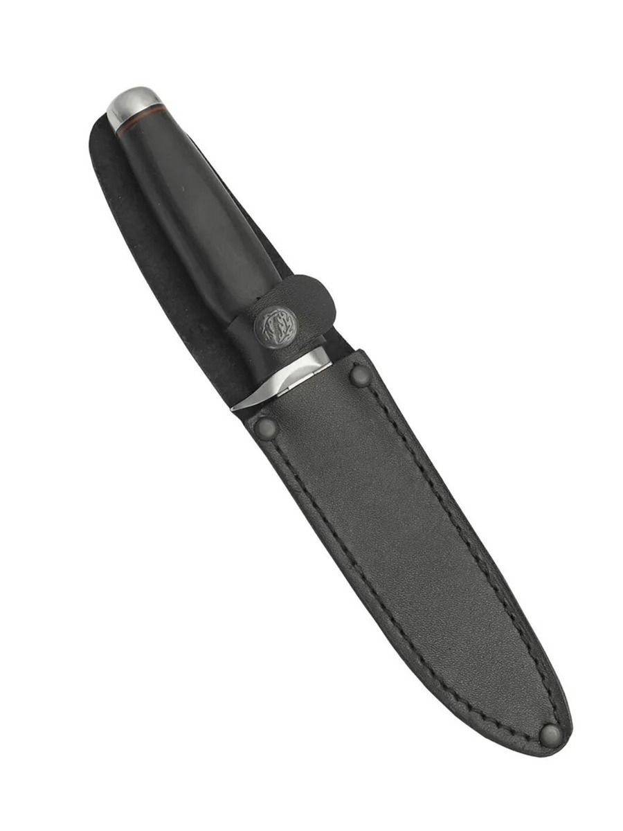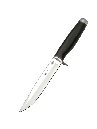 Благодаря обуху толщиной в 2,4 мм клинок достаточно прочен для нанесения колющих ударов даже в плотную преграду. Нож снабжен односторонней металлической гардой, которая надежно предохраняет руку от контакта с лезвием. Прямая деревянная рукоять из черного бакелита или светлого дерева с влагозащитной пропиткой имеет обтекаемую форму с плавной подпальцевой выемкой и усилена стальным навершием. В прежние времена мы сказали бы, что "Хорь-2" - орудие войны. Сейчас же скажем - вот отличный нож для охоты и путешествий.