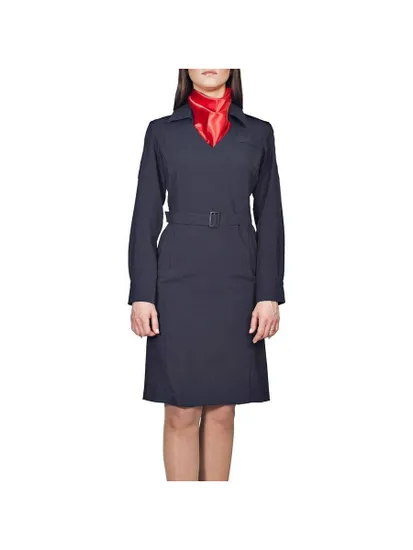 тк. Габардин, плотность 180 гм/м2 Платье для военнослужащих женского пола полуприлегающего силуэта со съёмным поясом, застёгивающимся на пряжку. Платье комплектуется шелковым шейным платком красного цвета.