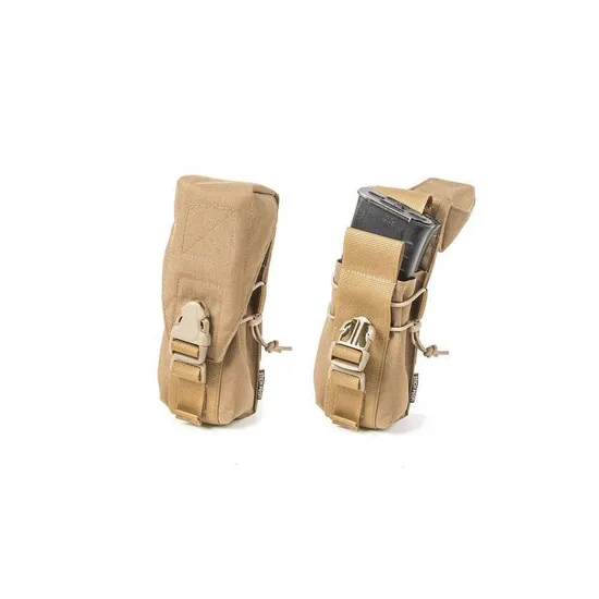- Подсумок под 2 магазина АК (molle) с эластичным жгутом гарантирует надежную фиксацию магазина в самых экстремальных режимах эксплуатации. При закрытом клапане – посредством кнопочной застежки и текстильной «липучки» Велкро. При открытом клапане – с помощью эластичного жгута регулируемой длины, естественной упругости материала (при клапане, заправленном внутрь, между магазином и задней стенкой подсумка).