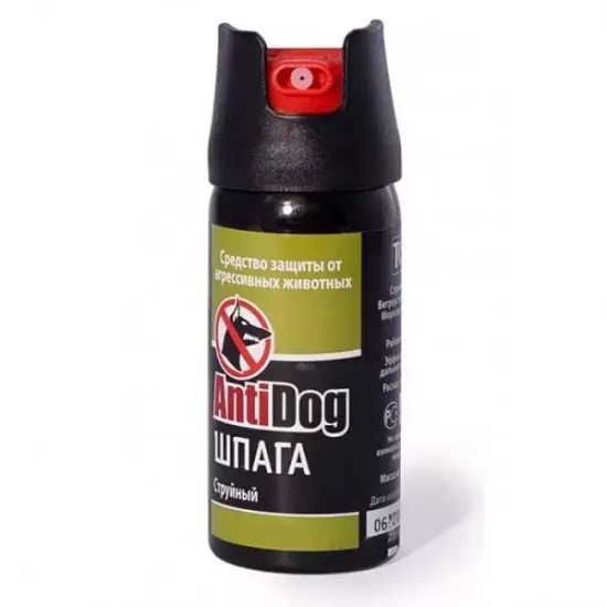 Распылитель (аэрозольный баллончик) AntiDog Шпага, 65 мл – это высокоэффективное средство от нападения собак, новая разработка российской компании «Техкрим». Продукт использует струйный тип распыления, и за счет невысокого респираторного эффекта подходит также для использования в помещениях. При нажатии на кнопку распылителя из него вырывается мощная струя специальной смеси, вызывающая крапивный эффект. За счет высокой эффективной дальности распыления (до 2,5 метров) он подходит для использования на средних дистанциях, позволяя не подпустить животное близко.