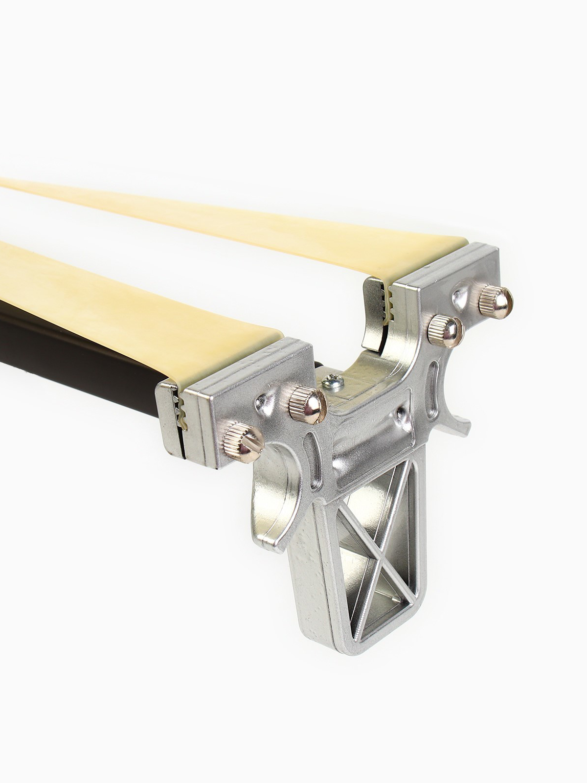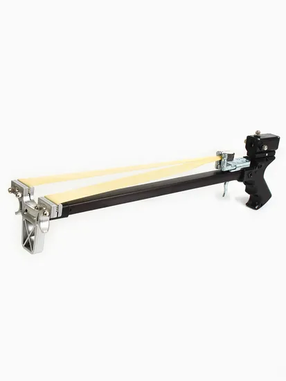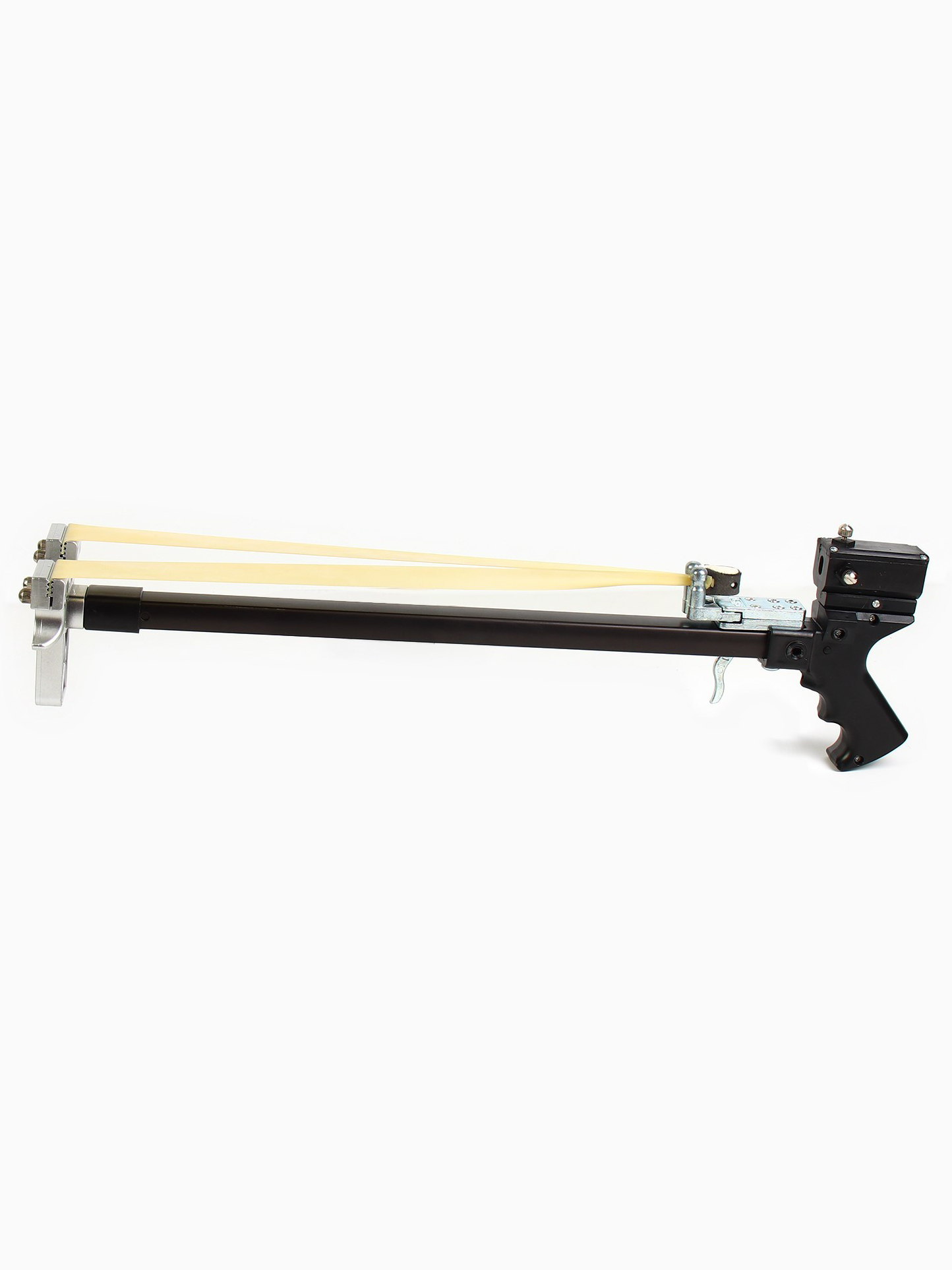 Рогатка ощущается массивной и уверенно лежит в руке за счёт длины и веса. Хват получается стабильным, удобно контролировать направление и работать сериями без лишнего дискомфорта.