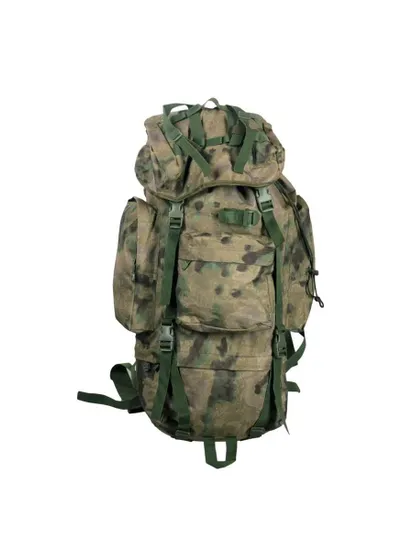 Вещмешок встроен и снизу и сверху. Верхний клапан закрывает рюкзак при помощи двух фастексов. На самом клапане рюкзака, крепление системы Молле и есть стропы для закрепления дополнительного оборудования. Так же на клапане есть 2 кармана на молнии, в одном из них чехол на случай дождя. На спине ручка для переноски рюкзака. Мягкие регулируемые лямки, есть грудная перемычка, 2 полукольца, лямки можно отрегулировать по росту. Есть поясная лямка с широкой стропой на большом фастексе. Внутри встроен алюминиевый съемный каркас. Так же рюкзак полностью проклеен водоотталкивающей мембраной.