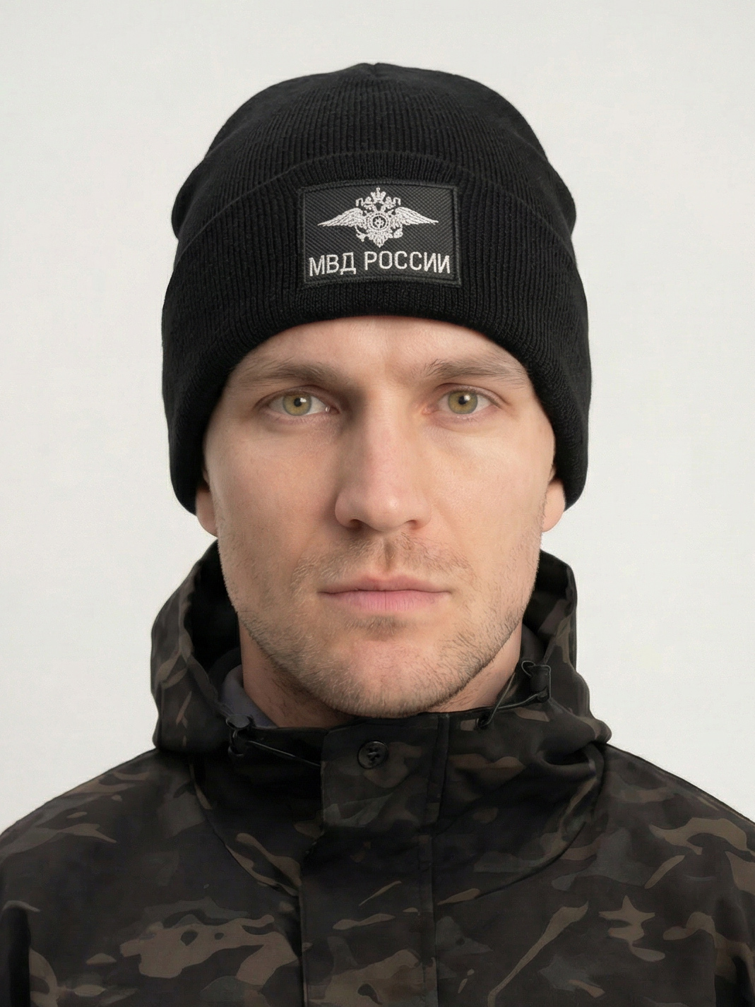 Вязаная шапка с отворотом и подкладкой из флиса с нашивкой для сотрудников МВД по новому приказу №777 от 17.11.2020г.
