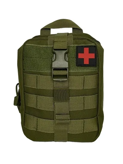 Тактическая сумка-аптечка БЕЗ наполнения. Размеры без упаковки: Высота 20 см. Ширина 15 см. Глубина 8 см. Сумка-аптечка не включает в комплект медицинские принадлежности. Подсумок медицинский, армейская аптечка отрывная, подсумок тактический MOLLE. ПУСТАЯ. БЕЗ НАПОЛНЕНИЯ. Характеристики: Вес без упаковки: 260 грамм. Материал: 100% полиэстер. Непромокаемый материал позволяет использовать в любом климате. Аптечка застегивается на молнию и фастекс. Внутри аптечки 1 отделение, 1 сетчатый карман, и пришиты эластичные ремни для ножей, фонарей, документов и прочих аксессуаров. На передней панели тактической аптечки есть крепления MOLLE (3 ряда по 4 шт) и липучка-велкро, на неё можно прикрепить шевроны с вашей группой крови и резус-фактором. На панели сзади есть 2 ремешка на металлических клепках, с их помощью аптечку можно повесить на ремень или рюкзак. Так же, если расстегнуть фастекс спереди, то можно убрать панель на липучке (покрывает всю заднюю стенку аптечки), и прикрепить аптечку с помощью липучки на этой задней стенке.