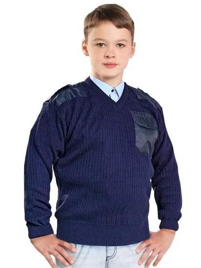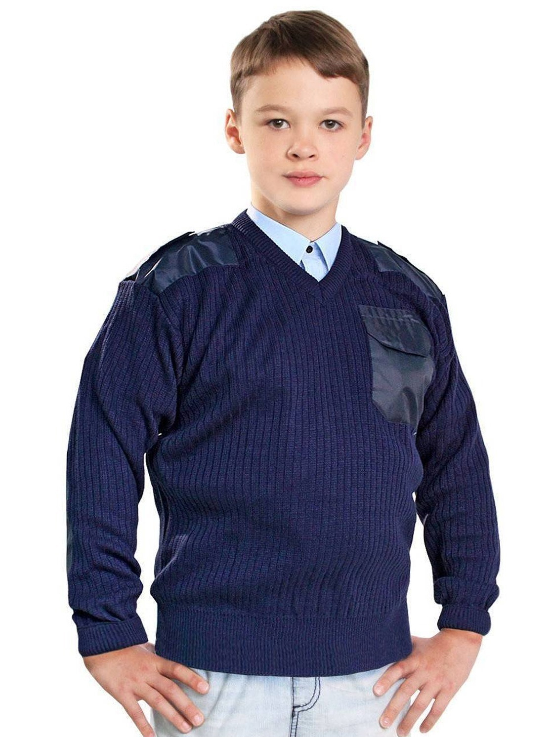 Джемпер детский синий с V-образным вырезом - форменная модель с усиленными элементами для повседневной носки.