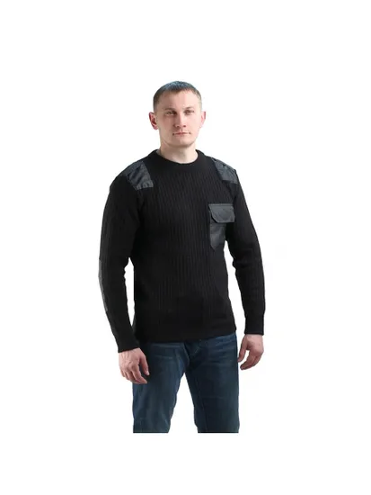 Свитер с усиливающими накладками из прочной ткани в зонах истирания.