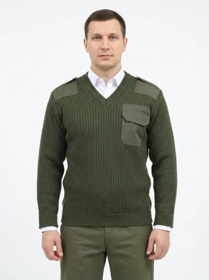 Свитер офицерский оливковый с V-образным вырезом - уставная модель с накладками и элементами для крепления погон.
