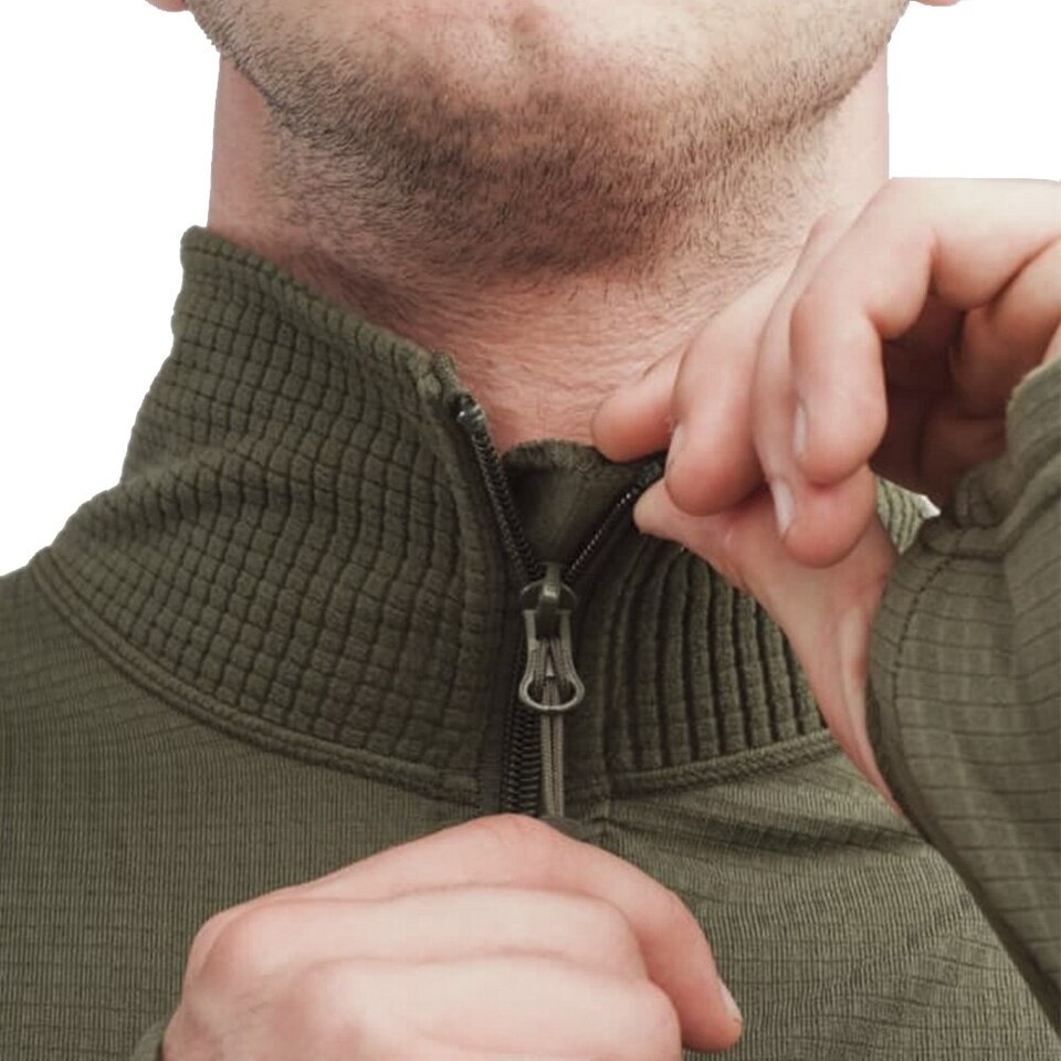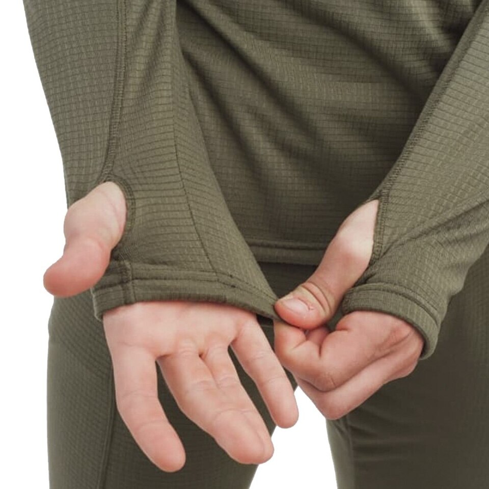 Термобельё облегает тело и работает как первый слой. Рубашка с длинным рукавом и высокой горловиной комфортна под курткой и бронежилетом, отверстия под большие пальцы фиксируют рукава и не дают им задираться. Кальсоны удобно садятся за счёт эластичного пояса и манжет, есть удобный гульфик.