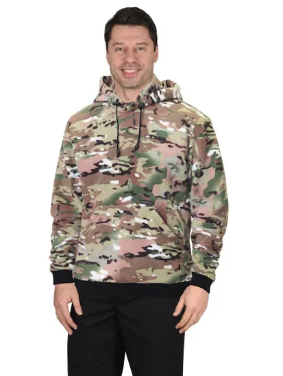 Толстовка прямого силуэта, без центральной застежки, с втачным капюшоном и нижним накладным большим фигурным карманом с боковыми наклонными входами.