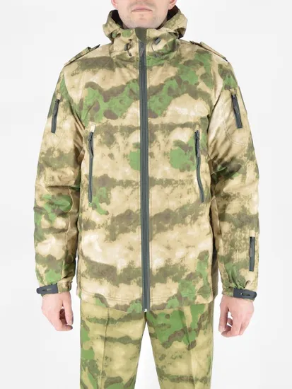 Куртка выполнена из мембранной ткани расцветки зеленый мох. Застёжка на молнию. Липучки велкро - пластик. На плечах погоны для крепления съёмных наплечных знаков. Капюшон и воротник отделаны флисом.