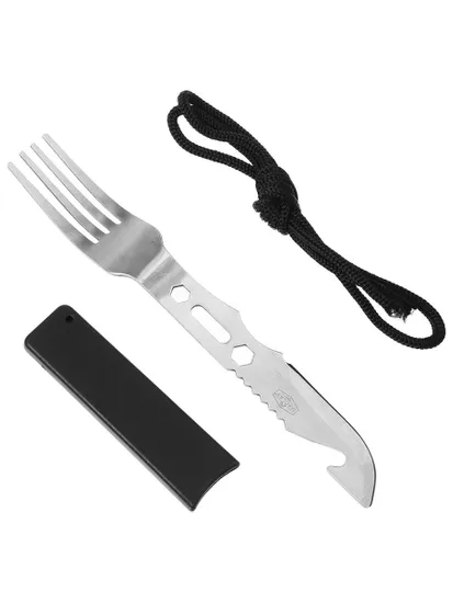Вилка-нож — необходимый аксессуар для туристических походов. Модель оснащена пластиковым чехлом. Изделие весит немного и занимает мало места в рюкзаке.
