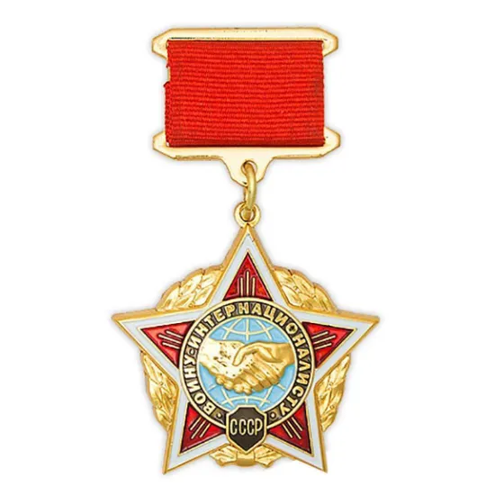 Нагрудный знак «Воину-интернационалисту». Материал изготовления – латунь, покрытие гальваническая позолота и эмаль. Прямоугольная колодка знака крепится к одежде при помощи болта и гайки.